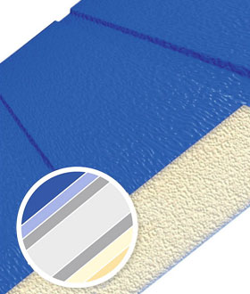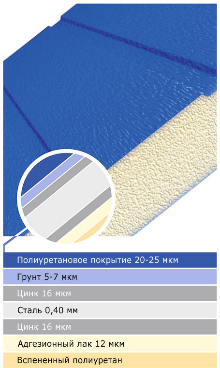 Цинковое покрытие толщиной 16 мкм, а также двухслойное полимерное покрытие толщиной 25-25 мкм надежно защищает поверхность сэндвич-панелей от механических повреждений и воздействия атмосферных осадков.
